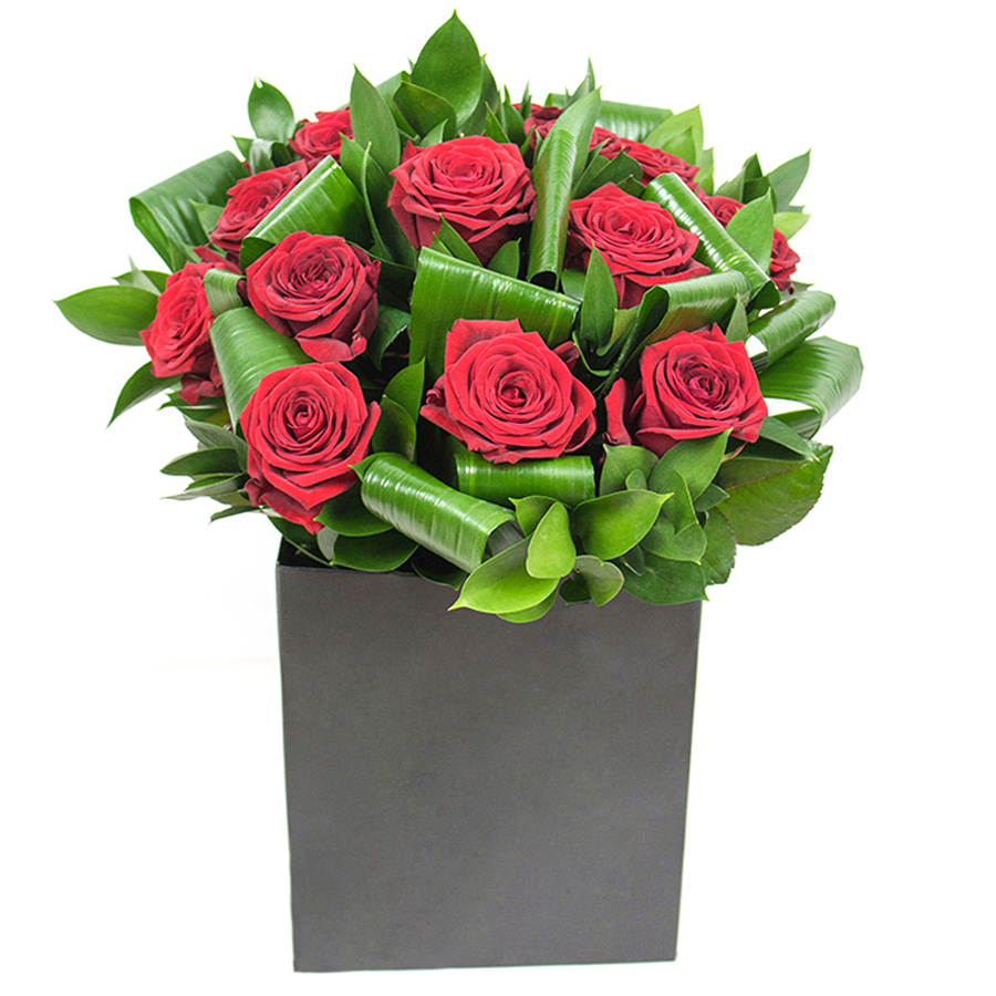 Admire the beauty and uniqueness of our graceful bouquet, featuring vivid red roses, lush aspidistra leaves, and delicate ruscus. This stunning arrangement adds elegance and style to any home or event.