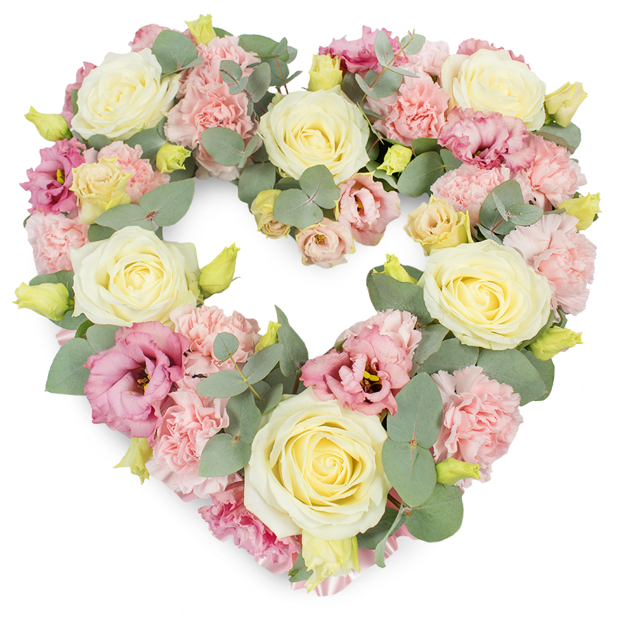 Express your sincere condolences with our Beautiful Open Heart Remembrance Bouquet. This stunning arrangement features a carefully curated mix of white roses, pink carnations, pink lisianthus, and eucalyptus leaves, artfully arranged to form an open heart symbolizing everlasting love.